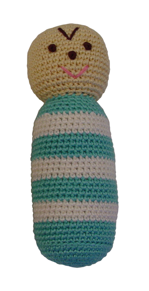 Sweet soft swaddle baby boy doll for creative play. From the amikins™ collection of artisan made - hand crocheted - ecofriendly products.